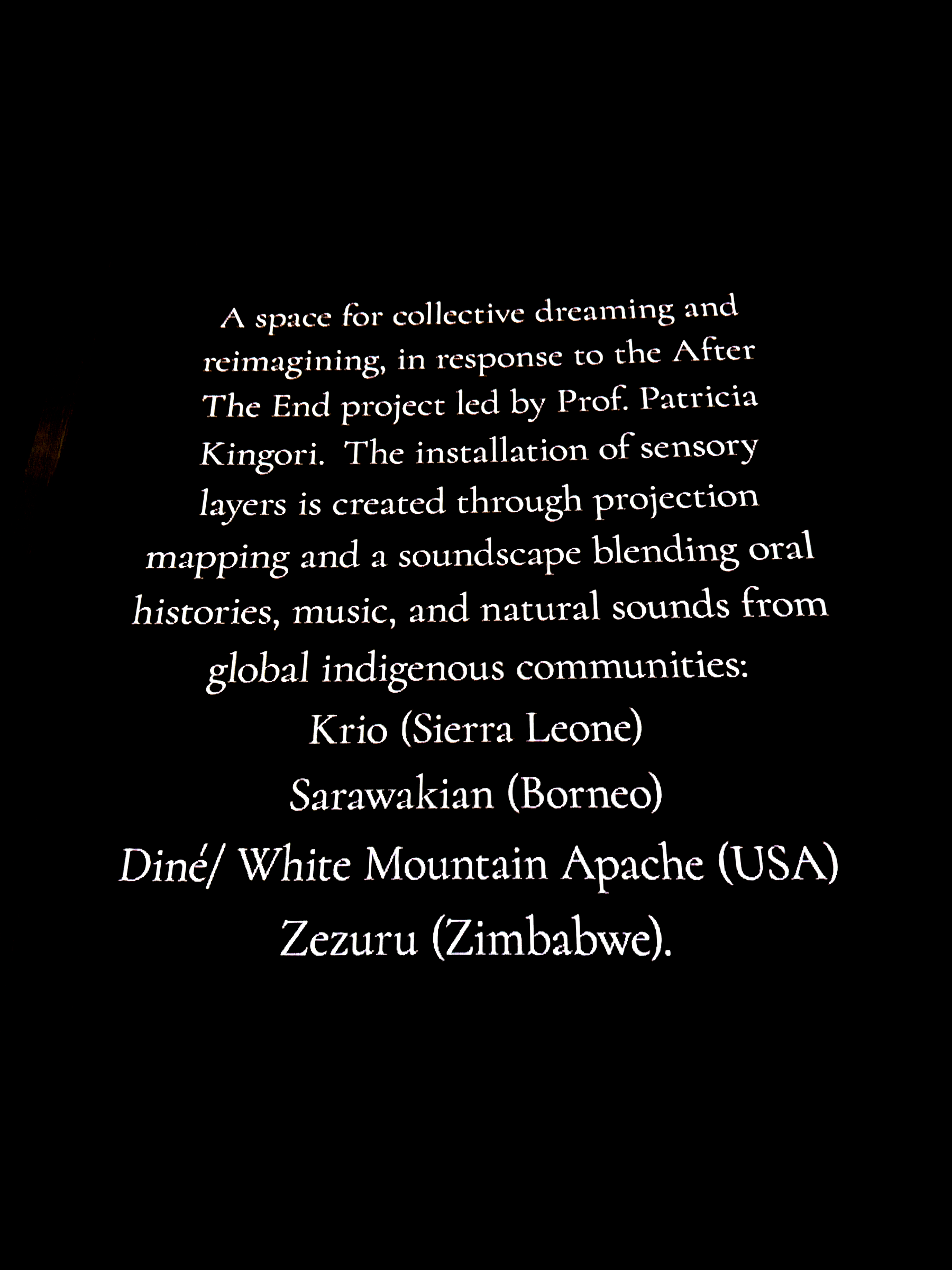 Collective Dreamscape continues to grow as an immersive non-linear journey through projection mapping, spatial audio, and ancestral ritual into a decolonised research praxis. Emerging from ethnographic research on how “crisis endings” (Zika in Brazil, Ebola in Sierra Leone, antibiotic resistance in Cambodia/Laos) diverge from lived realities, the work challenges Western linear narratives by centering Indigenous epistemologies and marginalised voices as knowledge producers. It is both a listening space and a gentle call to open perception – toward justice, repair, and the radical potential of being fully present.